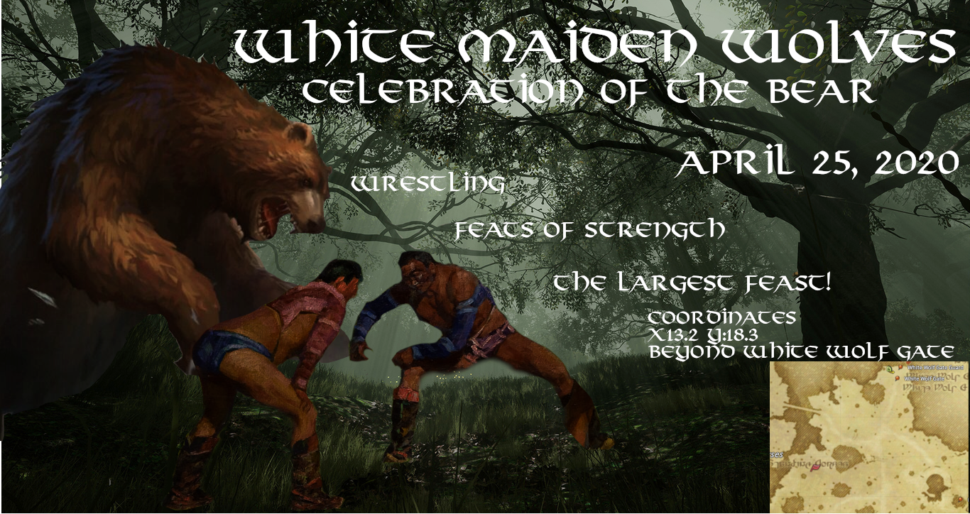 The White Maiden Wolves are celebrating the season through feats of skill and strength to pay homage to their demi-patron, The Bear. Come willing One and All to the North Shroud and test your might in trial and combat!Only natural weapons of fist, foot, and claw are permitted, so hone your talents!